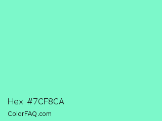 Hex #7cf8ca Color is a light green color and the nearest color is Aquamarine #7fffd4. Hex code #7cf8ca and RGB value is rgb(124,248,202). In RGB color space, this color is composed of 49% red, 97% green, 79% blue, In CMYK color space, this color is composed of 50% cyan, 0% magenta, 19% yellow , 3% black , In HSL color space, this color has a hue angle of 158° , 90% saturation and 73% lightness.