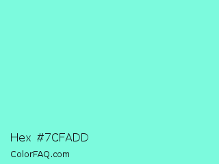 Hex #7cfadd Color is a light cyan color and the nearest color is Aquamarine #7fffd4. Hex code #7cfadd and RGB value is rgb(124,250,221). In RGB color space, this color is composed of 49% red, 98% green, 87% blue, In CMYK color space, this color is composed of 50% cyan, 0% magenta, 12% yellow , 2% black , In HSL color space, this color has a hue angle of 166° , 93% saturation and 73% lightness.