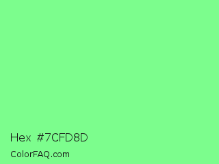 Hex #7cfd8d Color is a light green color and the nearest color is Light Green #90ee90. Hex code #7cfd8d and RGB value is rgb(124,253,141). In RGB color space, this color is composed of 49% red, 99% green, 55% blue, In CMYK color space, this color is composed of 51% cyan, 0% magenta, 44% yellow , 1% black , In HSL color space, this color has a hue angle of 128° , 97% saturation and 74% lightness.