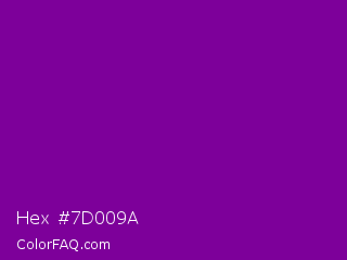 Hex #7d009a Color is a dark purple color and the nearest color is Dark Magenta #8b008b. Hex code #7d009a and RGB value is rgb(125,0,154). In RGB color space, this color is composed of 49% red, 0% green, 60% blue, In CMYK color space, this color is composed of 19% cyan, 100% magenta, 0% yellow , 40% black , In HSL color space, this color has a hue angle of 289° , 100% saturation and 30% lightness.