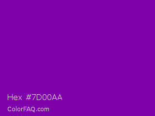 Hex #7d00aa Color is a normal purple color and the nearest color is Violet RYB #8601af. Hex code #7d00aa and RGB value is rgb(125,0,170). In RGB color space, this color is composed of 49% red, 0% green, 67% blue, In CMYK color space, this color is composed of 26% cyan, 100% magenta, 0% yellow , 33% black , In HSL color space, this color has a hue angle of 284° , 100% saturation and 33% lightness.