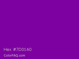 Hex #7d01a0 Color is a normal purple color and the nearest color is Violet RYB #8601af. Hex code #7d01a0 and RGB value is rgb(125,1,160). In RGB color space, this color is composed of 49% red, 0% green, 63% blue, In CMYK color space, this color is composed of 22% cyan, 99% magenta, 0% yellow , 37% black , In HSL color space, this color has a hue angle of 287° , 99% saturation and 32% lightness.