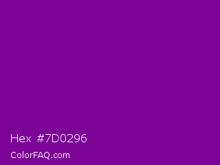 Hex #7d0296 Color is a dark purple color and the nearest color is Dark Magenta #8b008b. Hex code #7d0296 and RGB value is rgb(125,2,150). In RGB color space, this color is composed of 49% red, 1% green, 59% blue, In CMYK color space, this color is composed of 17% cyan, 99% magenta, 0% yellow , 41% black , In HSL color space, this color has a hue angle of 290° , 97% saturation and 30% lightness.