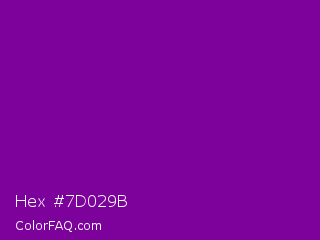 Hex #7d029b Color is a normal purple color and the nearest color is Dark Magenta #8b008b. Hex code #7d029b and RGB value is rgb(125,2,155). In RGB color space, this color is composed of 49% red, 1% green, 61% blue, In CMYK color space, this color is composed of 19% cyan, 99% magenta, 0% yellow , 39% black , In HSL color space, this color has a hue angle of 288° , 97% saturation and 31% lightness.