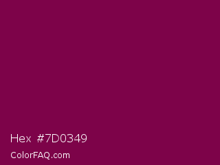 Hex #7d0349 Color is a dark magenta color and the nearest color is Rose Bud Cherry #800b47. Hex code #7d0349 and RGB value is rgb(125,3,73). In RGB color space, this color is composed of 49% red, 1% green, 29% blue, In CMYK color space, this color is composed of 0% cyan, 98% magenta, 42% yellow , 51% black , In HSL color space, this color has a hue angle of 326° , 95% saturation and 25% lightness.