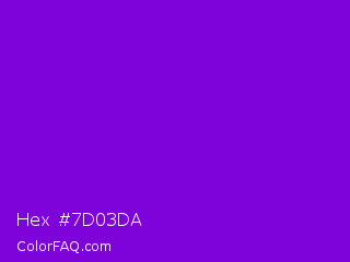 Hex #7d03da Color is a normal purple color and the nearest color is French Violet #8806ce. Hex code #7d03da and RGB value is rgb(125,3,218). In RGB color space, this color is composed of 49% red, 1% green, 85% blue, In CMYK color space, this color is composed of 43% cyan, 99% magenta, 0% yellow , 15% black , In HSL color space, this color has a hue angle of 274° , 97% saturation and 43% lightness.