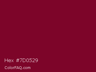Hex #7d0529 Color is a dark rose color and the nearest color is Burgundy #800020. Hex code #7d0529 and RGB value is rgb(125,5,41). In RGB color space, this color is composed of 49% red, 2% green, 16% blue, In CMYK color space, this color is composed of 0% cyan, 96% magenta, 67% yellow , 51% black , In HSL color space, this color has a hue angle of 342° , 92% saturation and 25% lightness.