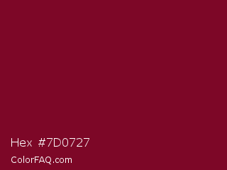 Hex #7d0727 Color is a dark rose color and the nearest color is Burgundy #800020. Hex code #7d0727 and RGB value is rgb(125,7,39). In RGB color space, this color is composed of 49% red, 3% green, 15% blue, In CMYK color space, this color is composed of 0% cyan, 94% magenta, 69% yellow , 51% black , In HSL color space, this color has a hue angle of 344° , 89% saturation and 26% lightness.