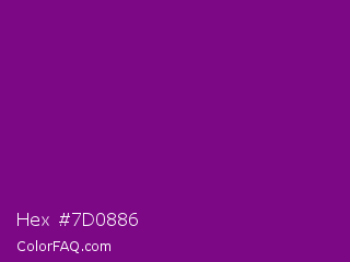 Hex #7d0886 Color is a dark magenta color and the nearest color is Patriarch #800080. Hex code #7d0886 and RGB value is rgb(125,8,134). In RGB color space, this color is composed of 49% red, 3% green, 53% blue, In CMYK color space, this color is composed of 7% cyan, 94% magenta, 0% yellow , 47% black , In HSL color space, this color has a hue angle of 296° , 89% saturation and 28% lightness.