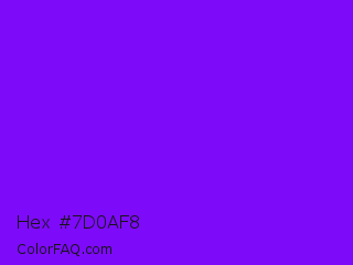 Hex #7d0af8 Color is a normal violet color and the nearest color is Violet Color Wheel #7f00ff. Hex code #7d0af8 and RGB value is rgb(125,10,248). In RGB color space, this color is composed of 49% red, 4% green, 97% blue, In CMYK color space, this color is composed of 50% cyan, 96% magenta, 0% yellow , 3% black , In HSL color space, this color has a hue angle of 269° , 94% saturation and 51% lightness.