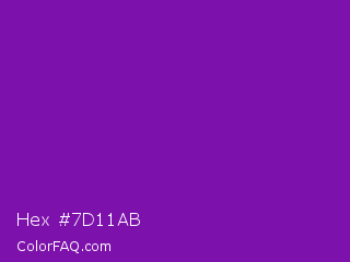 Hex #7d11ab Color is a normal purple color and the nearest color is Violet RYB #8601af. Hex code #7d11ab and RGB value is rgb(125,17,171). In RGB color space, this color is composed of 49% red, 7% green, 67% blue, In CMYK color space, this color is composed of 27% cyan, 90% magenta, 0% yellow , 33% black , In HSL color space, this color has a hue angle of 282° , 82% saturation and 37% lightness.
