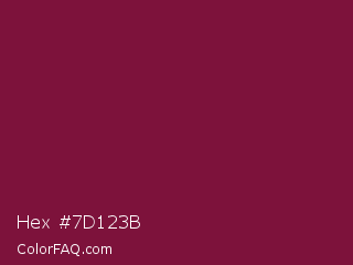 Hex #7d123b Color is a dark rose color and the nearest color is Claret #7f1734. Hex code #7d123b and RGB value is rgb(125,18,59). In RGB color space, this color is composed of 49% red, 7% green, 23% blue, In CMYK color space, this color is composed of 0% cyan, 86% magenta, 53% yellow , 51% black , In HSL color space, this color has a hue angle of 337° , 75% saturation and 28% lightness.