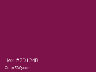 Hex #7d124b Color is a dark rose color and the nearest color is Pansy Purple #78184a. Hex code #7d124b and RGB value is rgb(125,18,75). In RGB color space, this color is composed of 49% red, 7% green, 29% blue, In CMYK color space, this color is composed of 0% cyan, 86% magenta, 40% yellow , 51% black , In HSL color space, this color has a hue angle of 328° , 75% saturation and 28% lightness.