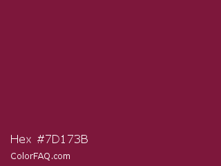 Hex #7d173b Color is a dark rose color and the nearest color is Claret #7f1734. Hex code #7d173b and RGB value is rgb(125,23,59). In RGB color space, this color is composed of 49% red, 9% green, 23% blue, In CMYK color space, this color is composed of 0% cyan, 82% magenta, 53% yellow , 51% black , In HSL color space, this color has a hue angle of 339° , 69% saturation and 29% lightness.