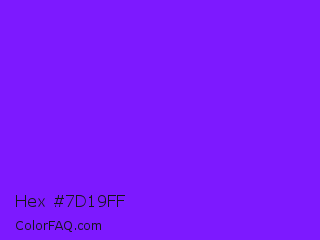 Hex #7d19ff Color is a normal violet color and the nearest color is Violet Color Wheel #7f00ff. Hex code #7d19ff and RGB value is rgb(125,25,255). In RGB color space, this color is composed of 49% red, 10% green, 100% blue, In CMYK color space, this color is composed of 51% cyan, 90% magenta, 0% yellow , 0% black , In HSL color space, this color has a hue angle of 266° , 100% saturation and 55% lightness.