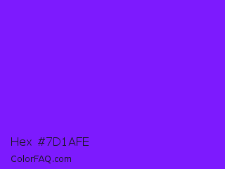 Hex #7d1afe Color is a normal violet color and the nearest color is Violet Color Wheel #7f00ff. Hex code #7d1afe and RGB value is rgb(125,26,254). In RGB color space, this color is composed of 49% red, 10% green, 100% blue, In CMYK color space, this color is composed of 51% cyan, 90% magenta, 0% yellow , 0% black , In HSL color space, this color has a hue angle of 266° , 99% saturation and 55% lightness.