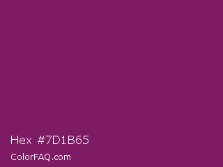 Hex #7d1b65 Color is a dark magenta color and the nearest color is Byzantium #702963. Hex code #7d1b65 and RGB value is rgb(125,27,101). In RGB color space, this color is composed of 49% red, 11% green, 40% blue, In CMYK color space, this color is composed of 0% cyan, 78% magenta, 19% yellow , 51% black , In HSL color space, this color has a hue angle of 315° , 64% saturation and 30% lightness.