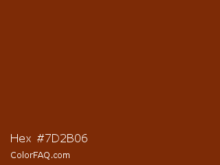 Hex #7d2b06 Color is a dark orange color and the nearest color is Smokey Topaz #832a0d. Hex code #7d2b06 and RGB value is rgb(125,43,6). In RGB color space, this color is composed of 49% red, 17% green, 2% blue, In CMYK color space, this color is composed of 0% cyan, 66% magenta, 95% yellow , 51% black , In HSL color space, this color has a hue angle of 19° , 91% saturation and 26% lightness.