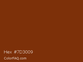Hex #7d3009 Color is a dark orange color and the nearest color is Smokey Topaz #832a0d. Hex code #7d3009 and RGB value is rgb(125,48,9). In RGB color space, this color is composed of 49% red, 19% green, 4% blue, In CMYK color space, this color is composed of 0% cyan, 62% magenta, 93% yellow , 51% black , In HSL color space, this color has a hue angle of 20° , 87% saturation and 26% lightness.