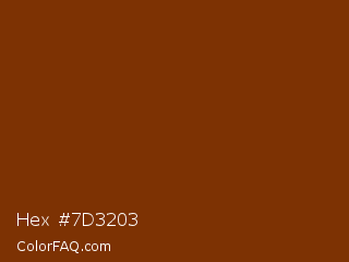 Hex #7d3203 Color is a dark orange color and the nearest color is Red Beech #7b3801. Hex code #7d3203 and RGB value is rgb(125,50,3). In RGB color space, this color is composed of 49% red, 20% green, 1% blue, In CMYK color space, this color is composed of 0% cyan, 60% magenta, 98% yellow , 51% black , In HSL color space, this color has a hue angle of 23° , 95% saturation and 25% lightness.