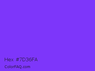 Hex #7d36fa Color is a normal violet color and the nearest color is Blue Violet #8a2be2. Hex code #7d36fa and RGB value is rgb(125,54,250). In RGB color space, this color is composed of 49% red, 21% green, 98% blue, In CMYK color space, this color is composed of 50% cyan, 78% magenta, 0% yellow , 2% black , In HSL color space, this color has a hue angle of 262° , 95% saturation and 60% lightness.