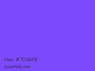 Hex #7d4afe Color is a light indigo color and the nearest color is Navy Purple #9457eb. Hex code #7d4afe and RGB value is rgb(125,74,254). In RGB color space, this color is composed of 49% red, 29% green, 100% blue, In CMYK color space, this color is composed of 51% cyan, 71% magenta, 0% yellow , 0% black , In HSL color space, this color has a hue angle of 257° , 99% saturation and 64% lightness.