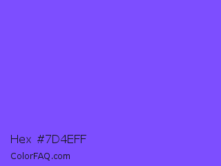 Hex #7d4eff Color is a light indigo color and the nearest color is Medium Slate Blue #7b68ee. Hex code #7d4eff and RGB value is rgb(125,78,255). In RGB color space, this color is composed of 49% red, 31% green, 100% blue, In CMYK color space, this color is composed of 51% cyan, 69% magenta, 0% yellow , 0% black , In HSL color space, this color has a hue angle of 256° , 100% saturation and 65% lightness.