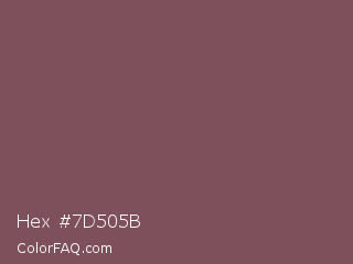 Hex #7d505b Color is a normal red color and the nearest color is Russett #755a57. Hex code #7d505b and RGB value is rgb(125,80,91). In RGB color space, this color is composed of 49% red, 31% green, 36% blue, In CMYK color space, this color is composed of 0% cyan, 36% magenta, 27% yellow , 51% black , In HSL color space, this color has a hue angle of 345° , 22% saturation and 40% lightness.