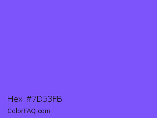 Hex #7d53fb Color is a light indigo color and the nearest color is Medium Slate Blue #7b68ee. Hex code #7d53fb and RGB value is rgb(125,83,251). In RGB color space, this color is composed of 49% red, 33% green, 98% blue, In CMYK color space, this color is composed of 50% cyan, 67% magenta, 0% yellow , 2% black , In HSL color space, this color has a hue angle of 255° , 95% saturation and 65% lightness.