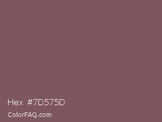 Hex #7d575d Color is a normal red color and the nearest color is Deep Taupe #7e5e60. Hex code #7d575d and RGB value is rgb(125,87,93). In RGB color space, this color is composed of 49% red, 34% green, 36% blue, In CMYK color space, this color is composed of 0% cyan, 30% magenta, 26% yellow , 51% black , In HSL color space, this color has a hue angle of 351° , 18% saturation and 42% lightness.