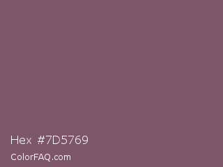 Hex #7d5769 Color is a normal rose color and the nearest color is Deep Taupe #7e5e60. Hex code #7d5769 and RGB value is rgb(125,87,105). In RGB color space, this color is composed of 49% red, 34% green, 41% blue, In CMYK color space, this color is composed of 0% cyan, 30% magenta, 16% yellow , 51% black , In HSL color space, this color has a hue angle of 332° , 18% saturation and 42% lightness.