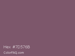Hex #7d576b Color is a normal rose color and the nearest color is Falcon #7f626d. Hex code #7d576b and RGB value is rgb(125,87,107). In RGB color space, this color is composed of 49% red, 34% green, 42% blue, In CMYK color space, this color is composed of 0% cyan, 30% magenta, 14% yellow , 51% black , In HSL color space, this color has a hue angle of 328° , 18% saturation and 42% lightness.