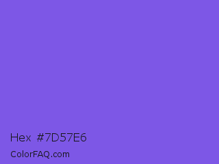 Hex #7d57e6 Color is a light indigo color and the nearest color is Medium Slate Blue #7b68ee. Hex code #7d57e6 and RGB value is rgb(125,87,230). In RGB color space, this color is composed of 49% red, 34% green, 90% blue, In CMYK color space, this color is composed of 46% cyan, 62% magenta, 0% yellow , 10% black , In HSL color space, this color has a hue angle of 256° , 74% saturation and 62% lightness.