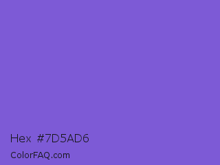 Hex #7d5ad6 Color is a normal indigo color and the nearest color is Slate Blue #6a5acd. Hex code #7d5ad6 and RGB value is rgb(125,90,214). In RGB color space, this color is composed of 49% red, 35% green, 84% blue, In CMYK color space, this color is composed of 42% cyan, 58% magenta, 0% yellow , 16% black , In HSL color space, this color has a hue angle of 257° , 60% saturation and 60% lightness.