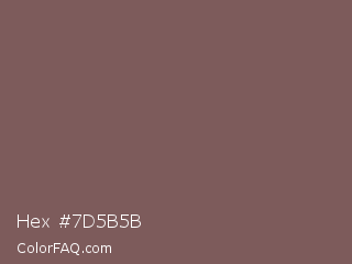 Hex #7d5b5b Color is a normal red color and the nearest color is Deep Taupe #7e5e60. Hex code #7d5b5b and RGB value is rgb(125,91,91). In RGB color space, this color is composed of 49% red, 36% green, 36% blue, In CMYK color space, this color is composed of 0% cyan, 27% magenta, 27% yellow , 51% black , In HSL color space, this color has a hue angle of 0° , 16% saturation and 42% lightness.