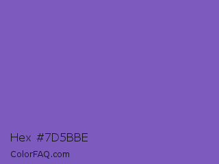 Hex #7d5bbe Color is a normal violet color and the nearest color is Fuchsia Blue #7a58c1. Hex code #7d5bbe and RGB value is rgb(125,91,190). In RGB color space, this color is composed of 49% red, 36% green, 75% blue, In CMYK color space, this color is composed of 34% cyan, 52% magenta, 0% yellow , 25% black , In HSL color space, this color has a hue angle of 261° , 43% saturation and 55% lightness.