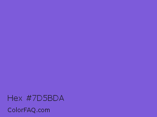 Hex #7d5bda Color is a light indigo color and the nearest color is Slate Blue #6a5acd. Hex code #7d5bda and RGB value is rgb(125,91,218). In RGB color space, this color is composed of 49% red, 36% green, 85% blue, In CMYK color space, this color is composed of 43% cyan, 58% magenta, 0% yellow , 15% black , In HSL color space, this color has a hue angle of 256° , 63% saturation and 61% lightness.