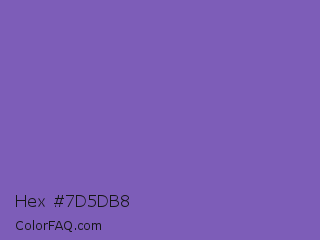 Hex #7d5db8 Color is a normal violet color and the nearest color is Fuchsia Blue #7a58c1. Hex code #7d5db8 and RGB value is rgb(125,93,184). In RGB color space, this color is composed of 49% red, 36% green, 72% blue, In CMYK color space, this color is composed of 32% cyan, 49% magenta, 0% yellow , 28% black , In HSL color space, this color has a hue angle of 261° , 39% saturation and 54% lightness.