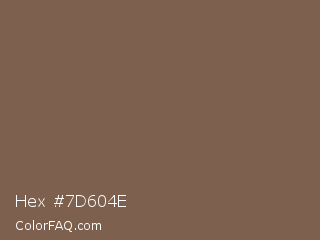 Hex #7d604e Color is a normal orange color and the nearest color is Roman Coffee #795d4c. Hex code #7d604e and RGB value is rgb(125,96,78). In RGB color space, this color is composed of 49% red, 38% green, 31% blue, In CMYK color space, this color is composed of 0% cyan, 23% magenta, 38% yellow , 51% black , In HSL color space, this color has a hue angle of 23° , 23% saturation and 40% lightness.