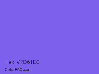 Hex #7d61ec Color is a light indigo color and the nearest color is Medium Slate Blue #7b68ee. Hex code #7d61ec and RGB value is rgb(125,97,236). In RGB color space, this color is composed of 49% red, 38% green, 93% blue, In CMYK color space, this color is composed of 47% cyan, 59% magenta, 0% yellow , 7% black , In HSL color space, this color has a hue angle of 252° , 79% saturation and 65% lightness.