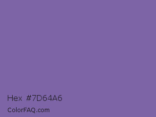 Hex #7d64a6 Color is a normal violet color and the nearest color is Deluge #7563a8. Hex code #7d64a6 and RGB value is rgb(125,100,166). In RGB color space, this color is composed of 49% red, 39% green, 65% blue, In CMYK color space, this color is composed of 25% cyan, 40% magenta, 0% yellow , 35% black , In HSL color space, this color has a hue angle of 263° , 27% saturation and 52% lightness.