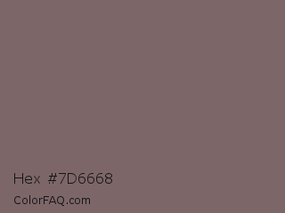 Hex #7d6668 Color is a normal red color and the nearest color is Falcon #7f626d. Hex code #7d6668 and RGB value is rgb(125,102,104). In RGB color space, this color is composed of 49% red, 40% green, 41% blue, In CMYK color space, this color is composed of 0% cyan, 18% magenta, 17% yellow , 51% black , In HSL color space, this color has a hue angle of 355° , 10% saturation and 45% lightness.