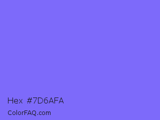 Hex #7d6afa Color is a light indigo color and the nearest color is Medium Slate Blue #7b68ee. Hex code #7d6afa and RGB value is rgb(125,106,250). In RGB color space, this color is composed of 49% red, 42% green, 98% blue, In CMYK color space, this color is composed of 50% cyan, 58% magenta, 0% yellow , 2% black , In HSL color space, this color has a hue angle of 248° , 94% saturation and 70% lightness.