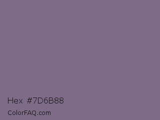 Hex #7d6b88 Color is a normal purple color and the nearest color is Rum #796989. Hex code #7d6b88 and RGB value is rgb(125,107,136). In RGB color space, this color is composed of 49% red, 42% green, 53% blue, In CMYK color space, this color is composed of 8% cyan, 21% magenta, 0% yellow , 47% black , In HSL color space, this color has a hue angle of 277° , 12% saturation and 48% lightness.