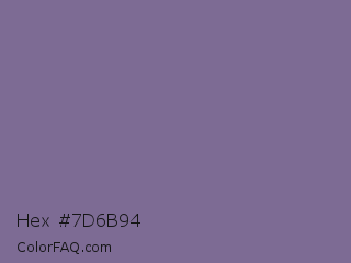 Hex #7d6b94 Color is a normal violet color and the nearest color is Rum #796989. Hex code #7d6b94 and RGB value is rgb(125,107,148). In RGB color space, this color is composed of 49% red, 42% green, 58% blue, In CMYK color space, this color is composed of 16% cyan, 28% magenta, 0% yellow , 42% black , In HSL color space, this color has a hue angle of 266° , 16% saturation and 50% lightness.