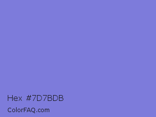 Hex #7d7bdb Color is a light indigo color and the nearest color is Moody Blue #7f76d3. Hex code #7d7bdb and RGB value is rgb(125,123,219). In RGB color space, this color is composed of 49% red, 48% green, 86% blue, In CMYK color space, this color is composed of 43% cyan, 44% magenta, 0% yellow , 14% black , In HSL color space, this color has a hue angle of 241° , 57% saturation and 67% lightness.