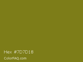 Hex #7d7d18 Color is a dark yellow color and the nearest color is Pacifika #778120. Hex code #7d7d18 and RGB value is rgb(125,125,24). In RGB color space, this color is composed of 49% red, 49% green, 9% blue, In CMYK color space, this color is composed of 0% cyan, 0% magenta, 81% yellow , 51% black , In HSL color space, this color has a hue angle of 60° , 68% saturation and 29% lightness.