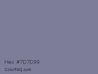 Hex #7d7d99 Color is a normal blue color and the nearest color is Waterloo #7b7c94. Hex code #7d7d99 and RGB value is rgb(125,125,153). In RGB color space, this color is composed of 49% red, 49% green, 60% blue, In CMYK color space, this color is composed of 18% cyan, 18% magenta, 0% yellow , 40% black , In HSL color space, this color has a hue angle of 240° , 12% saturation and 55% lightness.