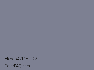 Hex #7d8092 Color is a normal blue color and the nearest color is Waterloo #7b7c94. Hex code #7d8092 and RGB value is rgb(125,128,146). In RGB color space, this color is composed of 49% red, 50% green, 57% blue, In CMYK color space, this color is composed of 14% cyan, 12% magenta, 0% yellow , 43% black , In HSL color space, this color has a hue angle of 231° , 9% saturation and 53% lightness.