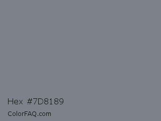 Hex #7d8189 Color is a normal blue color and the nearest color is Gunsmoke #828685. Hex code #7d8189 and RGB value is rgb(125,129,137). In RGB color space, this color is composed of 49% red, 51% green, 54% blue, In CMYK color space, this color is composed of 9% cyan, 6% magenta, 0% yellow , 46% black , In HSL color space, this color has a hue angle of 220° , 5% saturation and 51% lightness.
